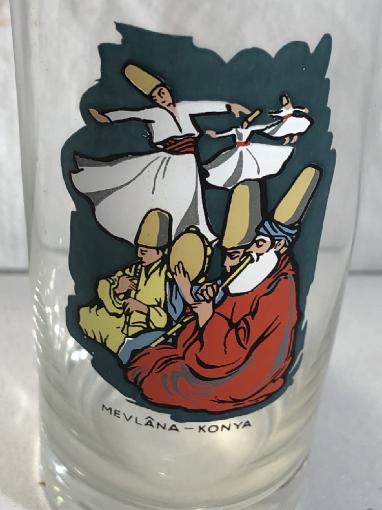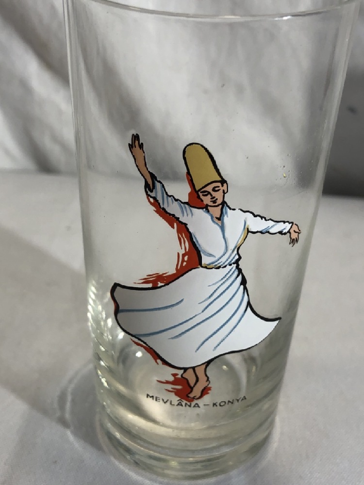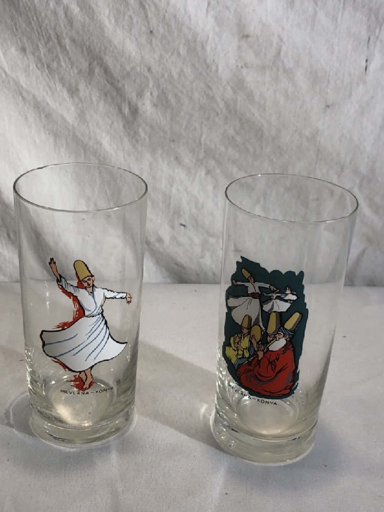 2- Vtg Dervish Mevlana Figure Drinking Glasses- Islam Philosopher, Mystic Dancing- 4 3/4” T