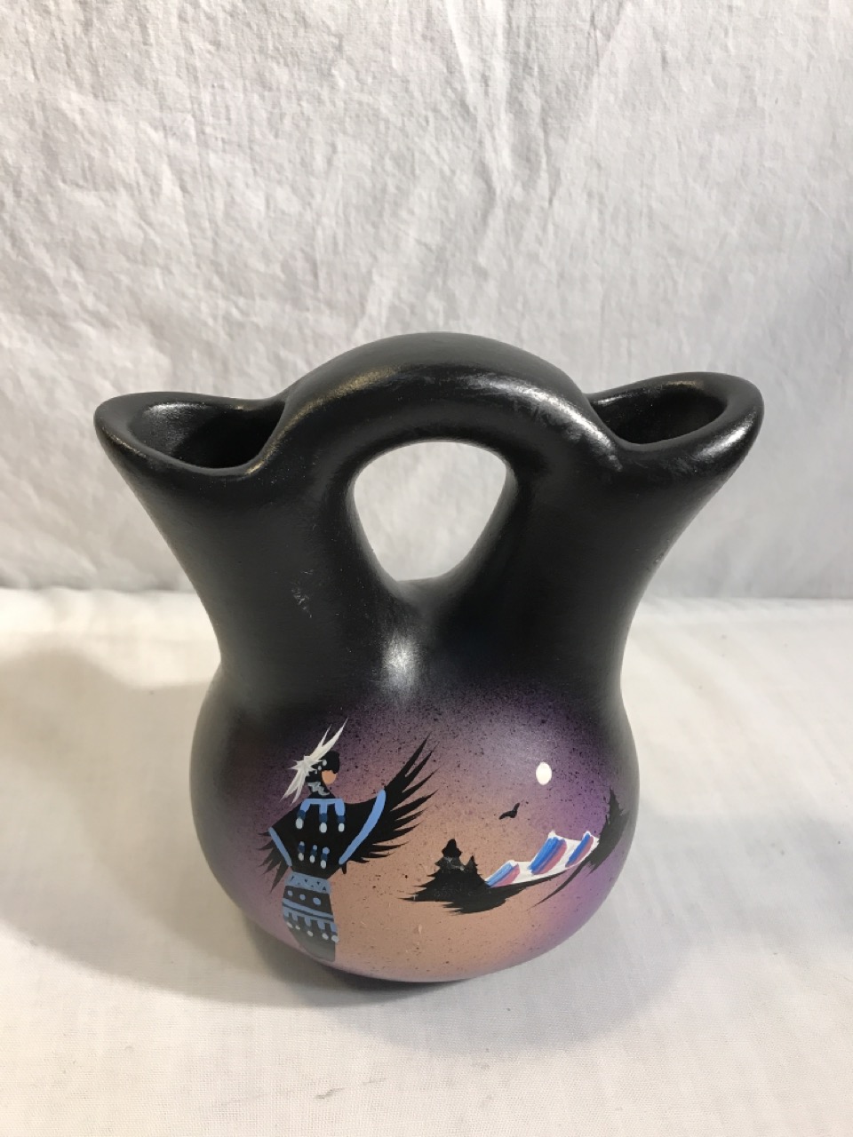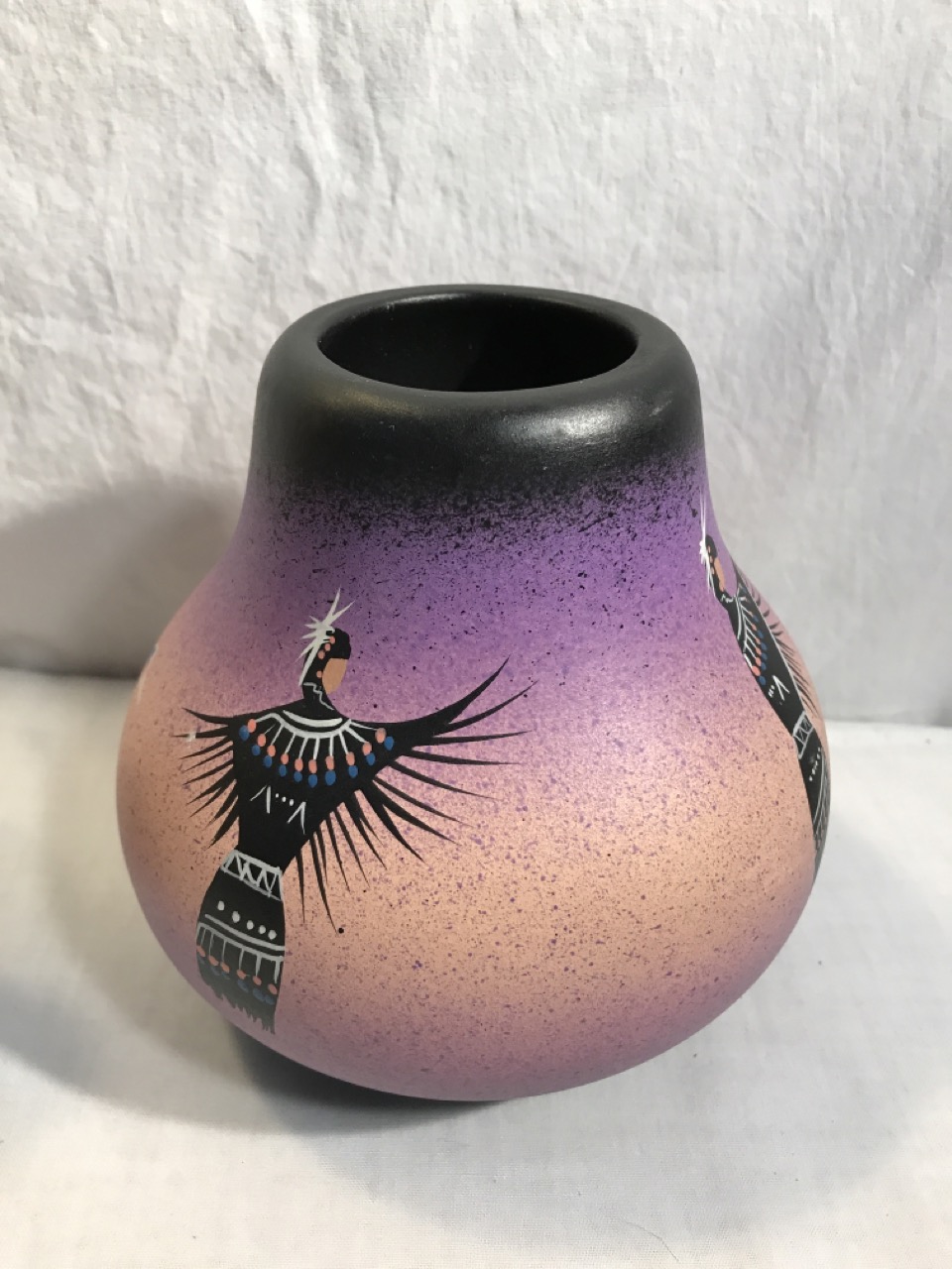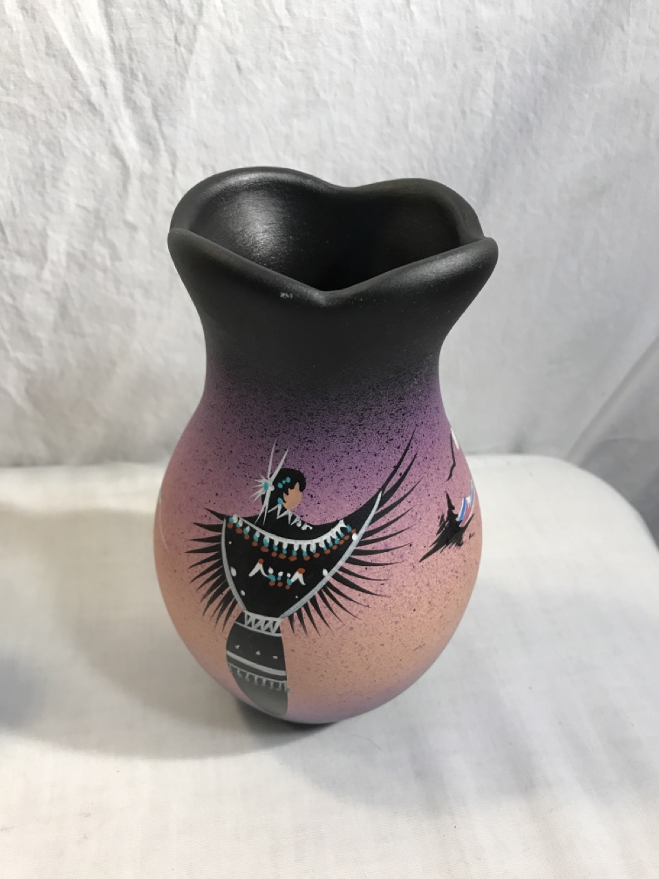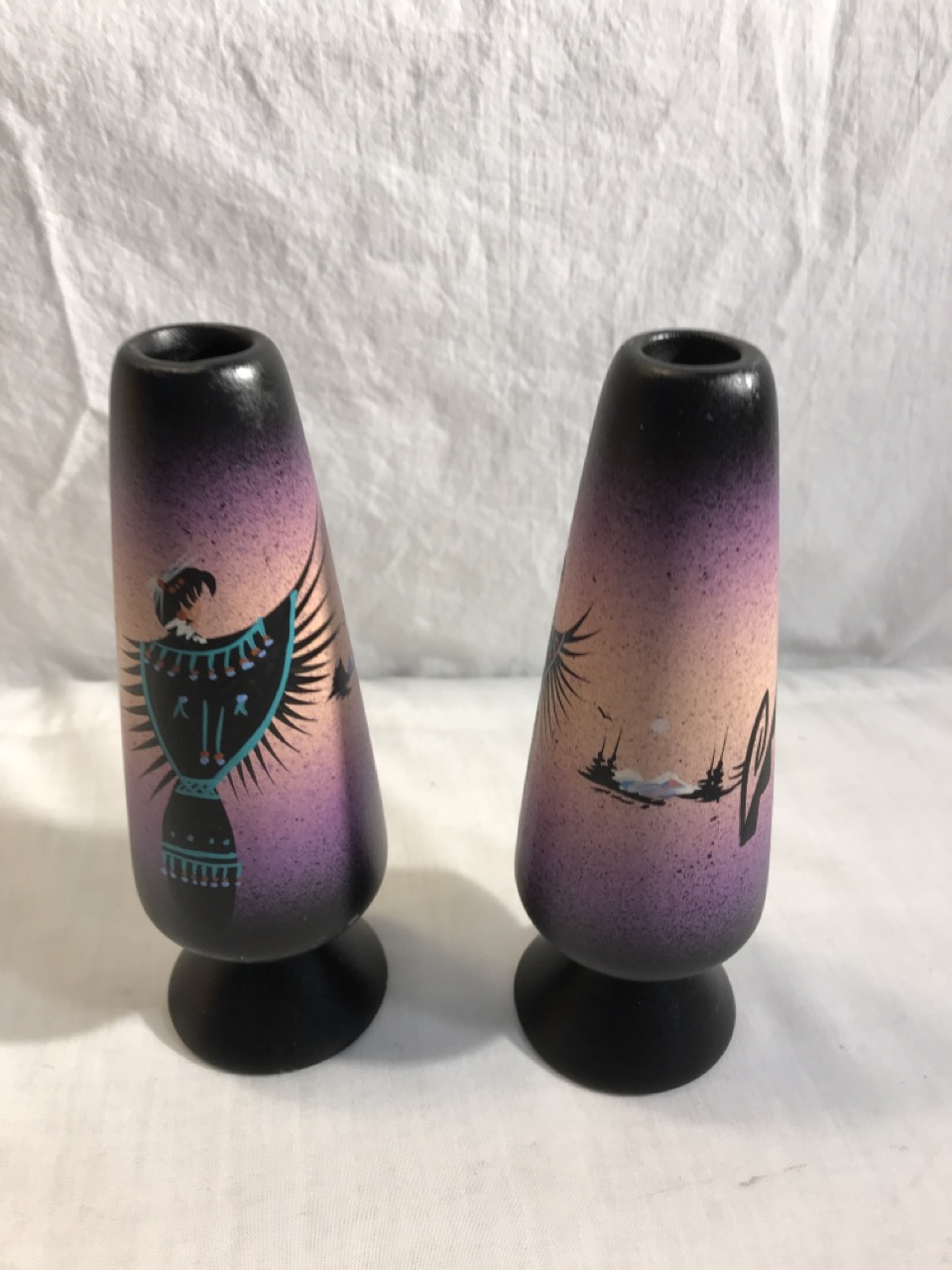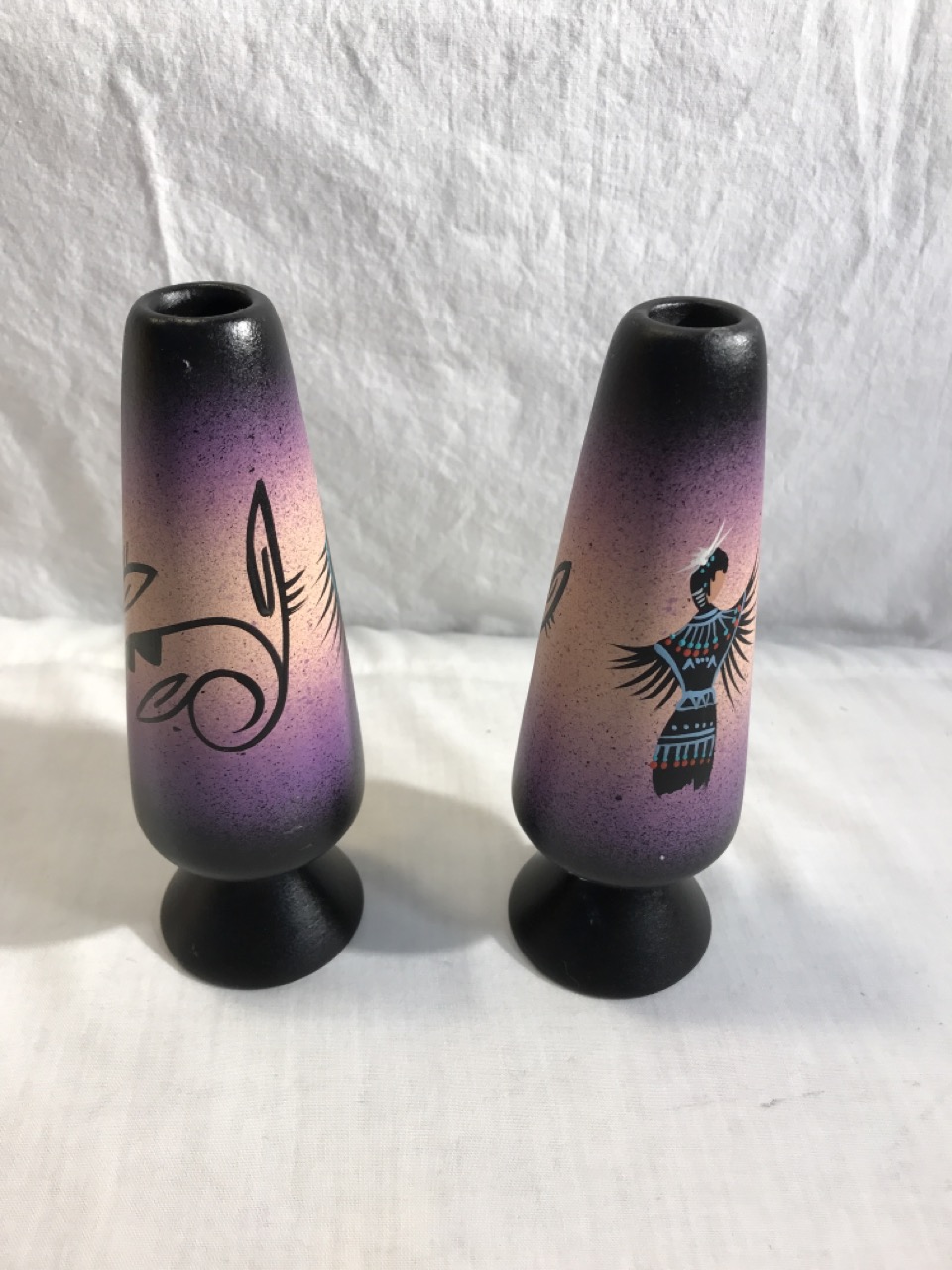 Native American Navajo Signed Pottery Lot including Mystic Maiden Vase 6”, Purple Spirit Bear 4”, Dancing Women w/ Feather Shawl 7” Vase & 2- Bud Vases 6.5”, & 6” Wedding Vase
