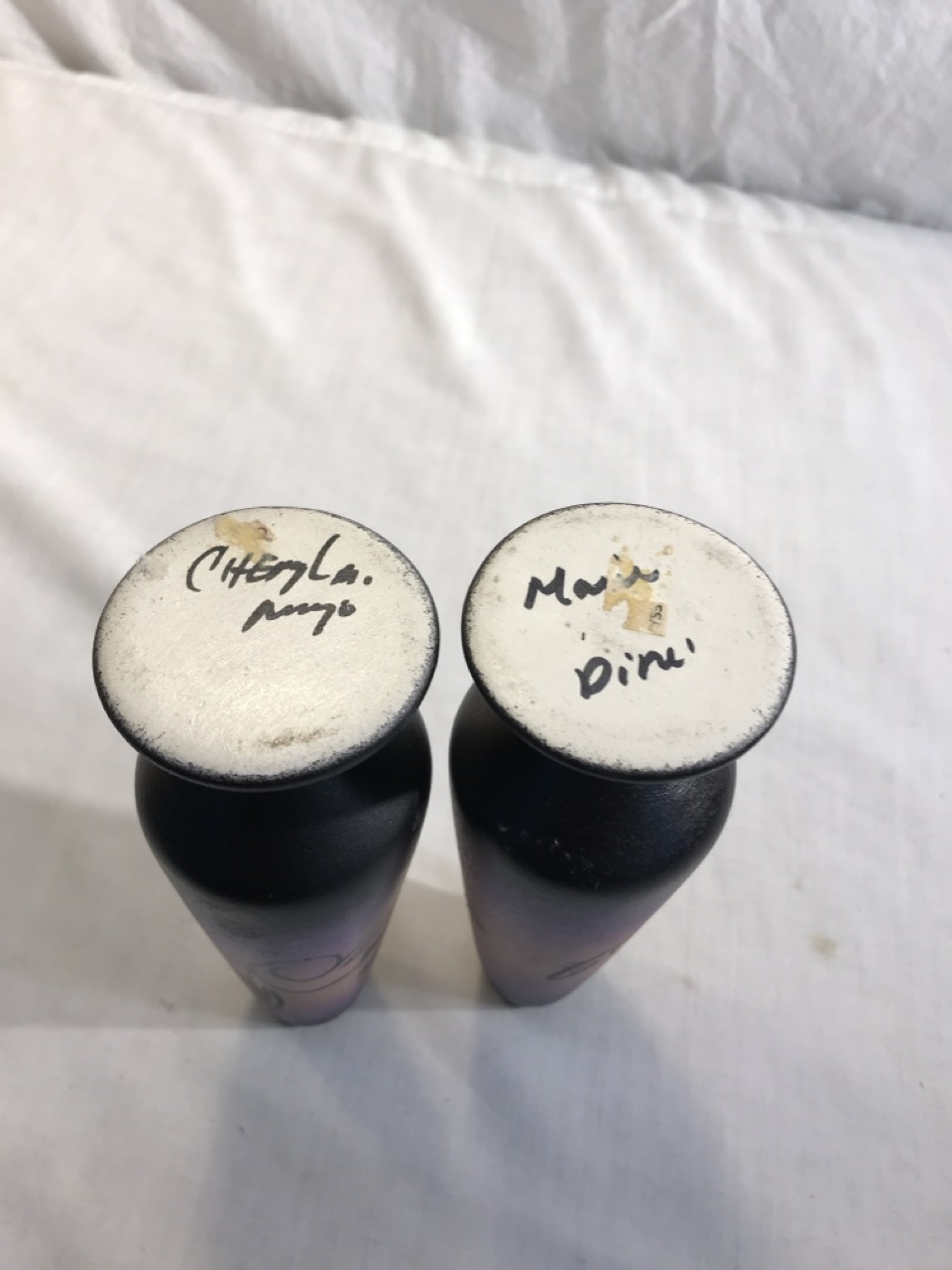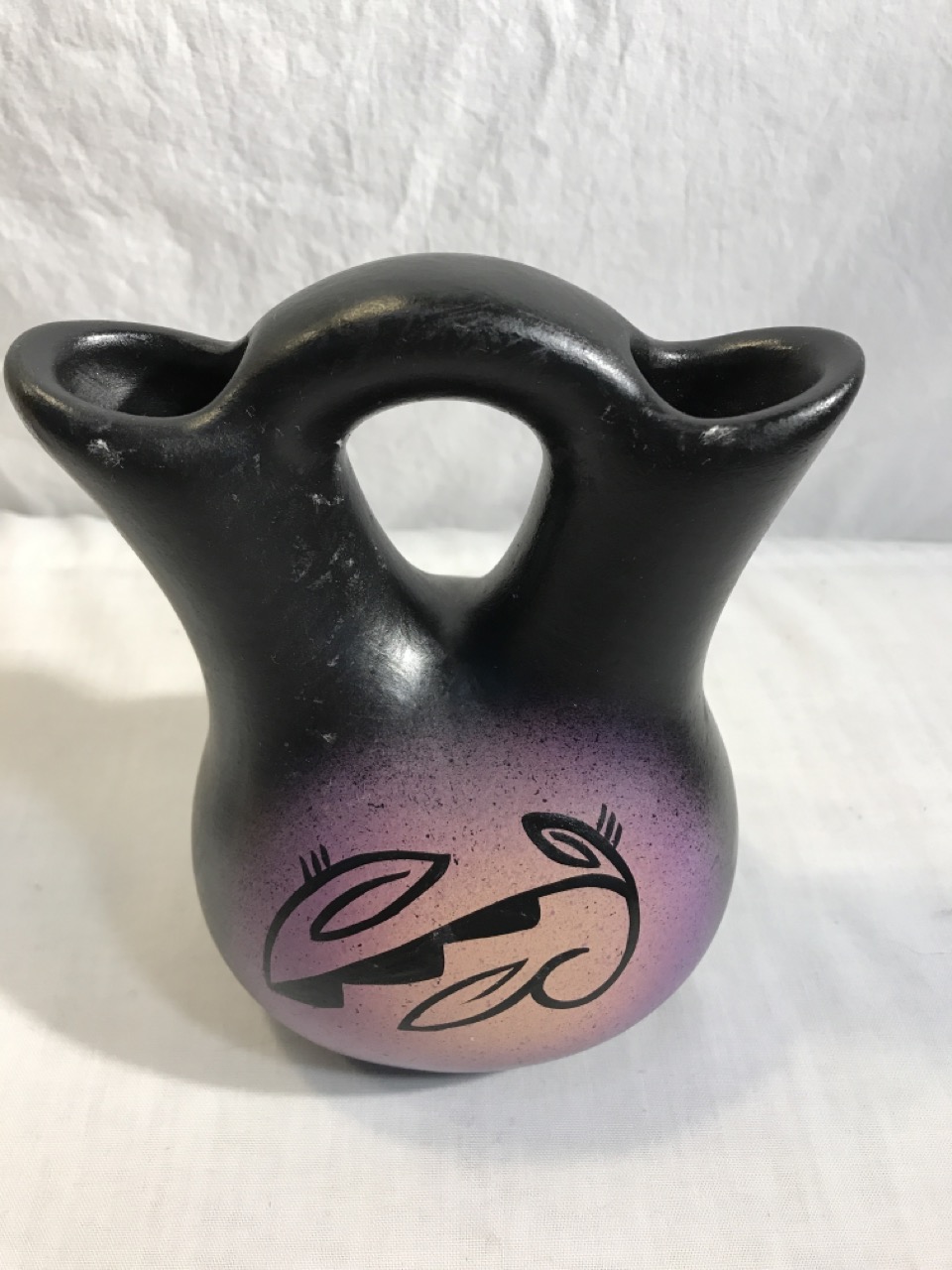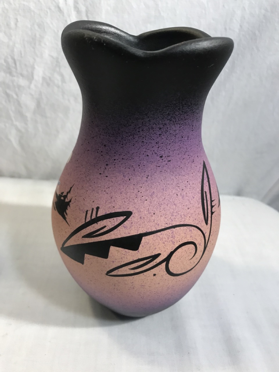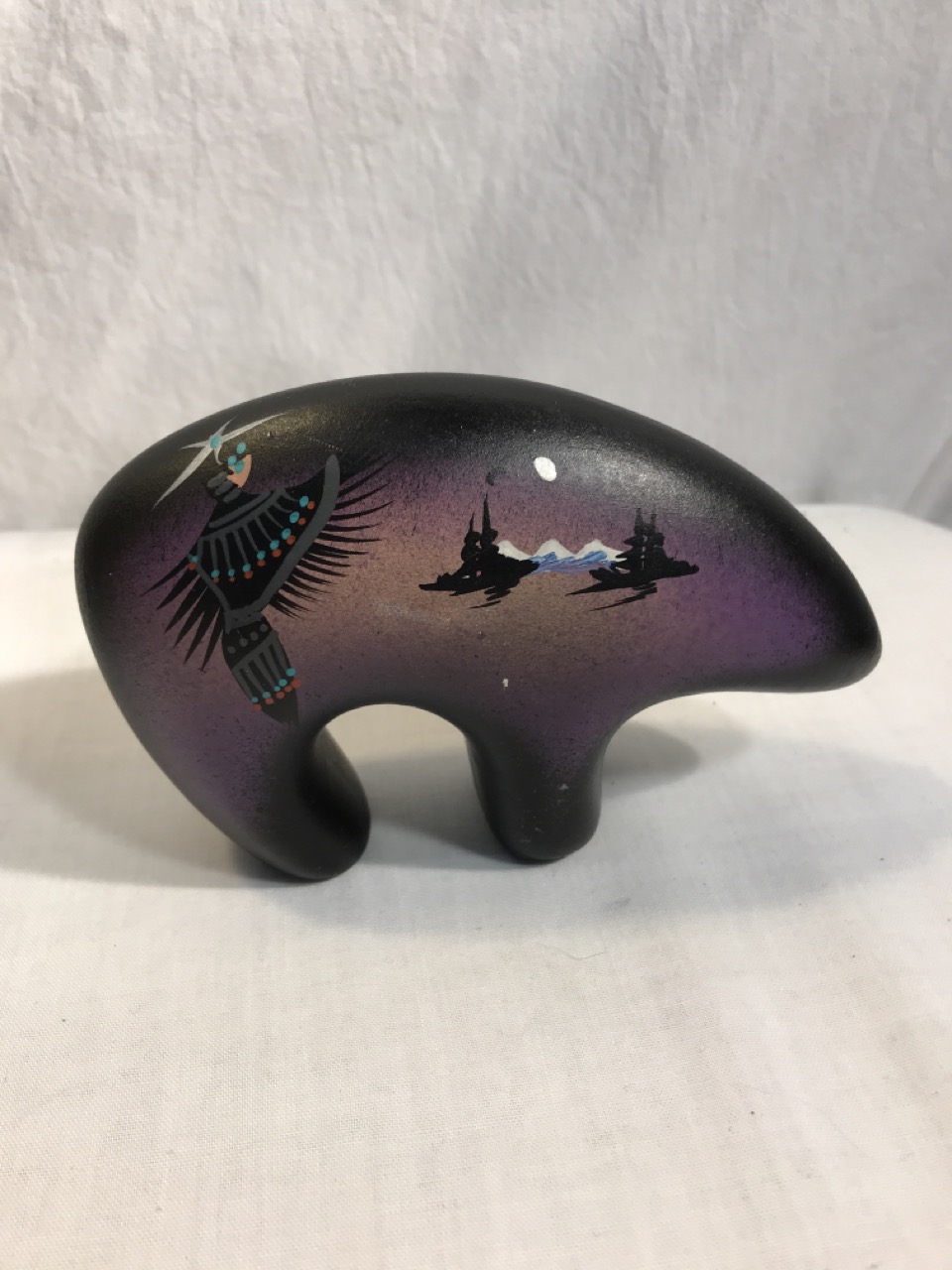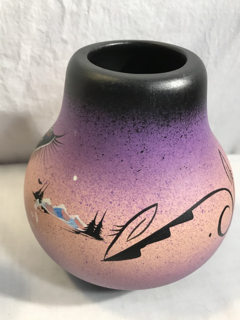 Native American Navajo Signed Pottery Lot including Mystic Maiden Vase 6”, Purple Spirit Bear 4”, Dancing Women w/ Feather Shawl 7” Vase & 2- Bud Vases 6.5”, & 6” Wedding Vase
