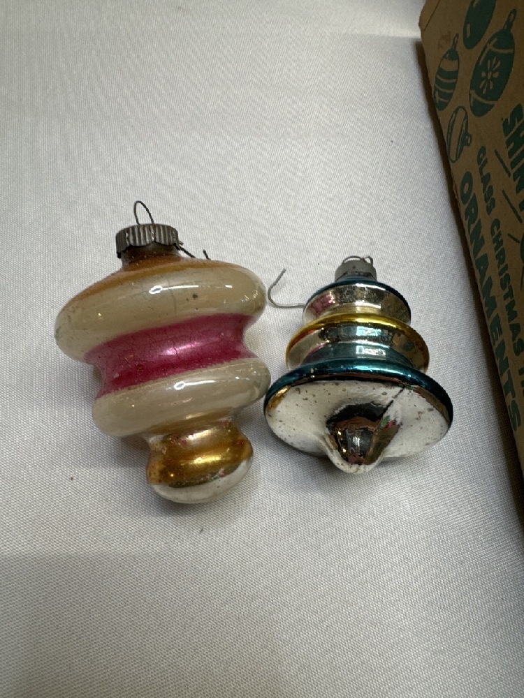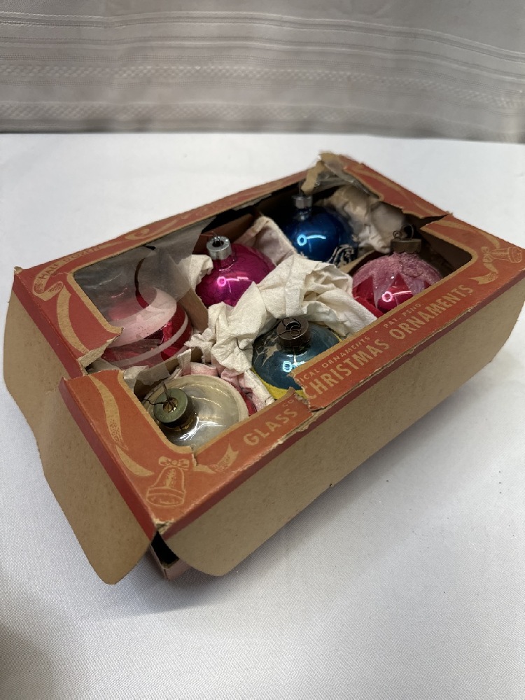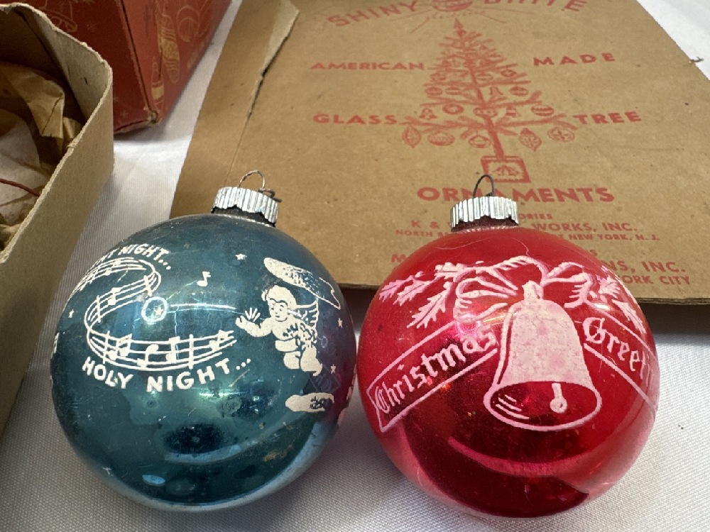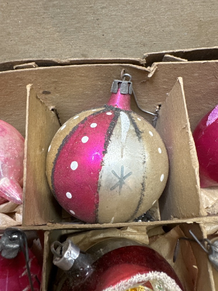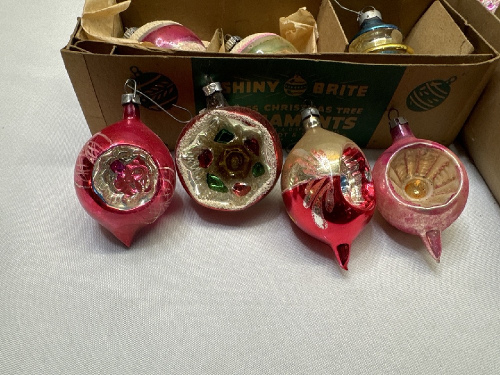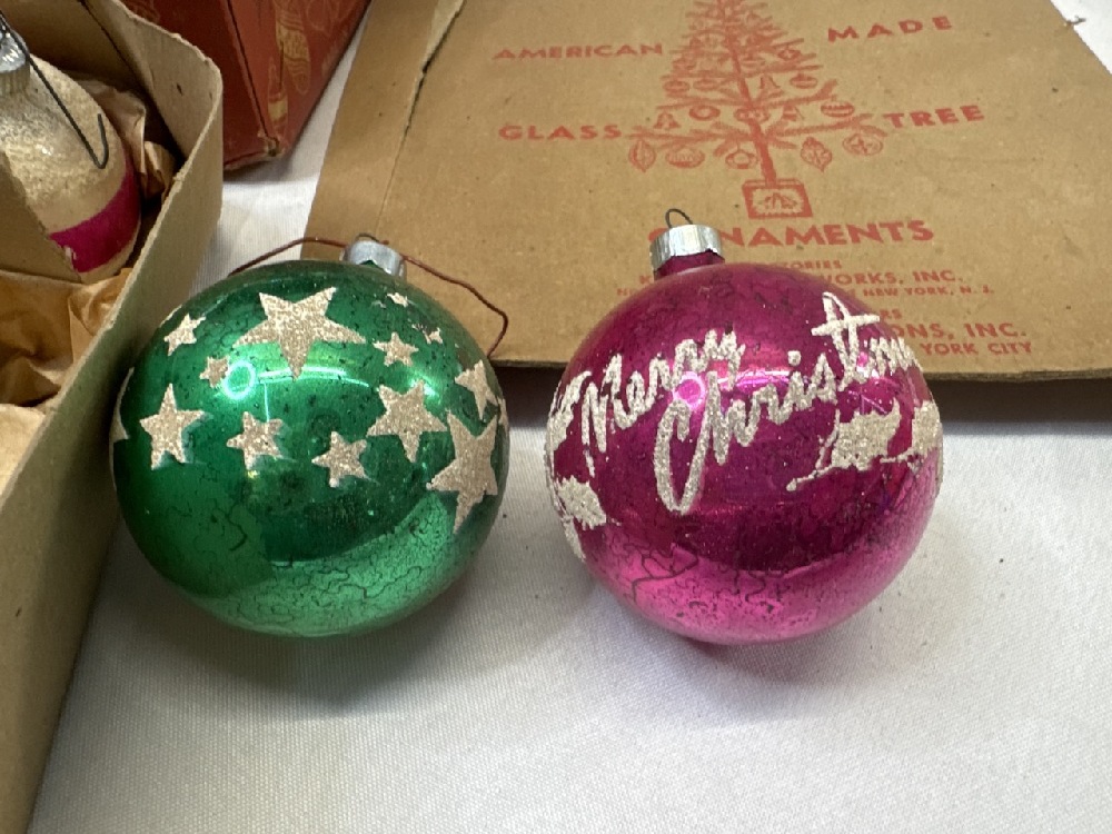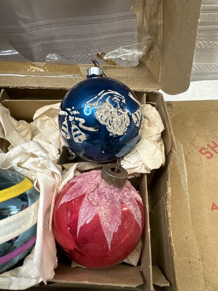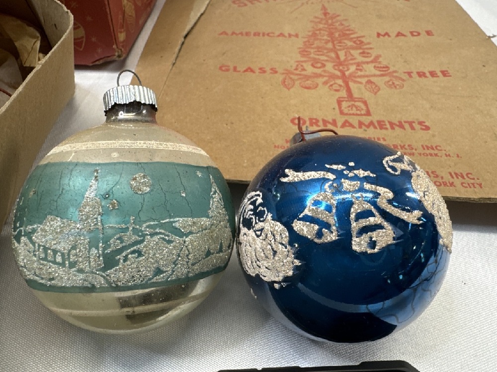 Early Antique Ornaments 3 Boxes including WWII Unsilvered, Reflector Balls, Shiny Brite Stencil Scene, Shiny Brite Mushroom, Mercury Glass, ++