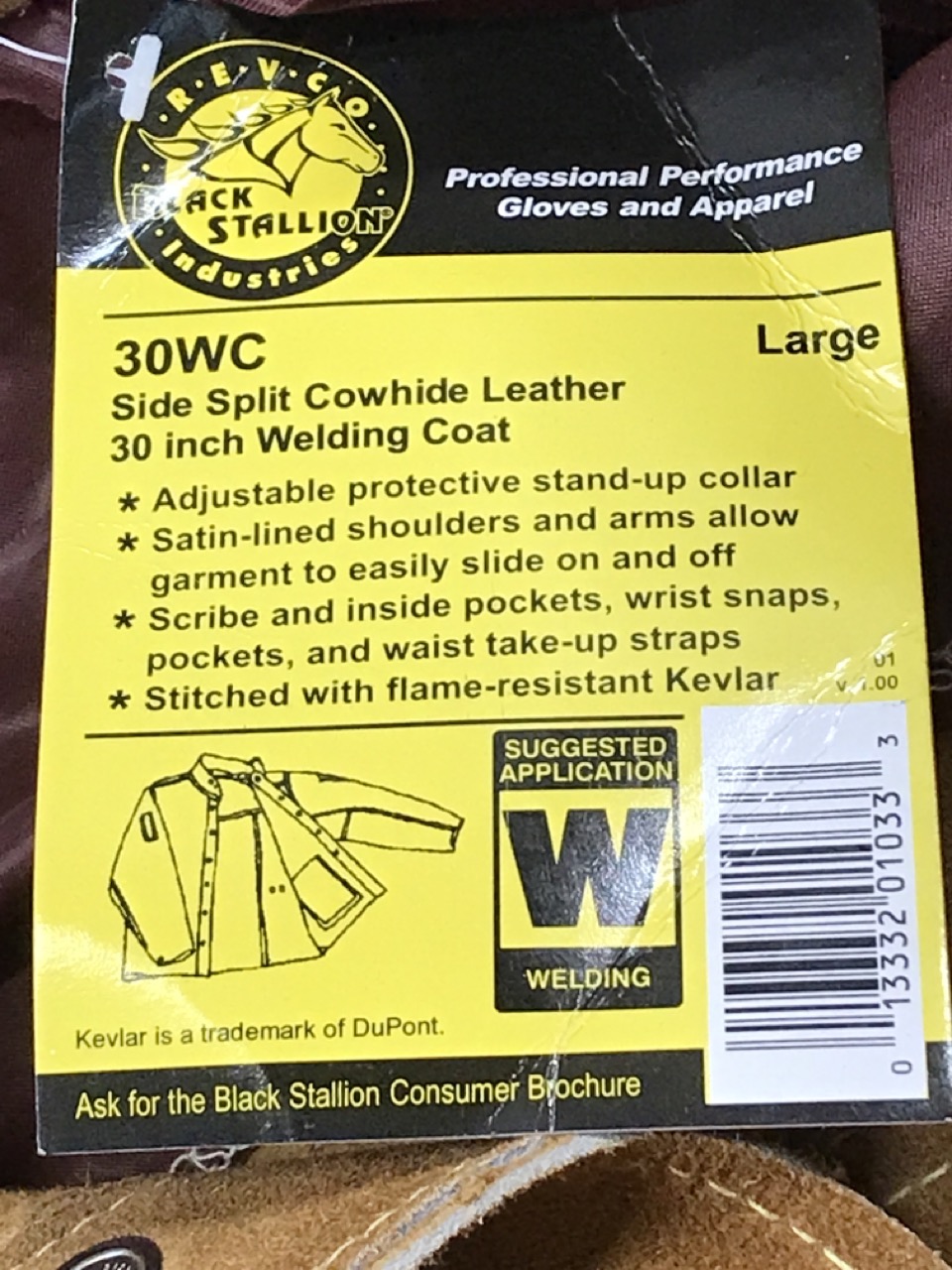 Black Stallion 30WC Cowhide Leather Welding Coat and Tillman 1260 Gloves - New with Tags- 30” / Sz Large