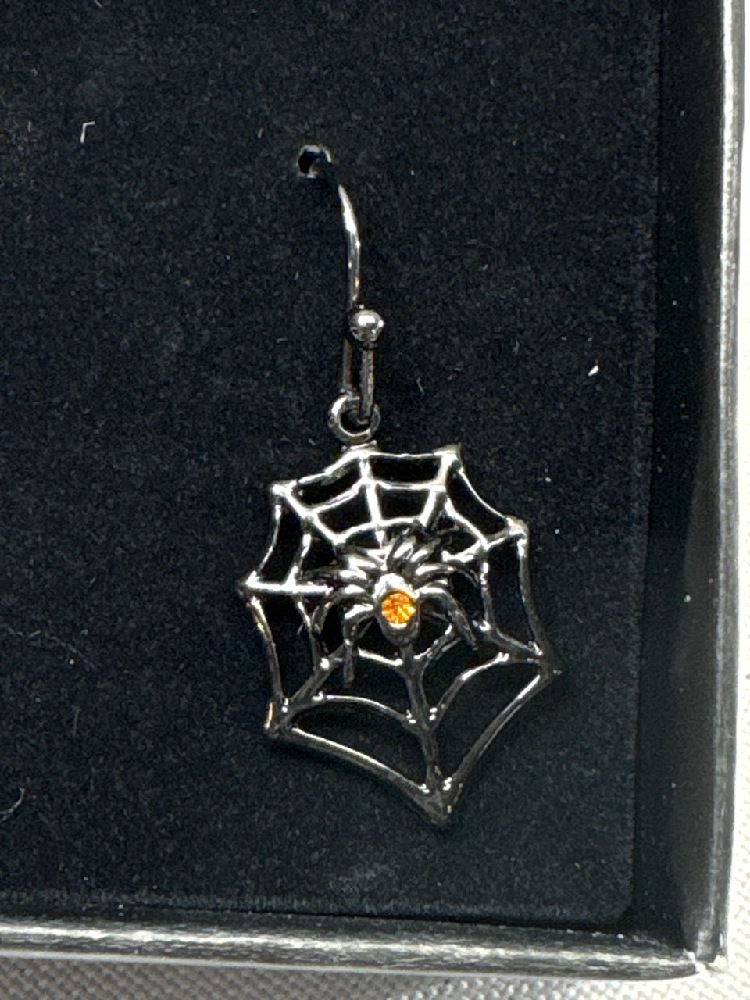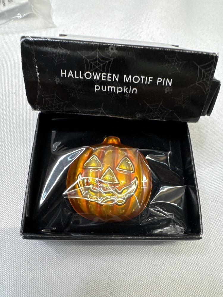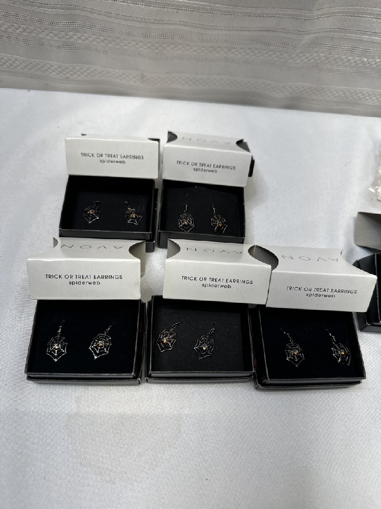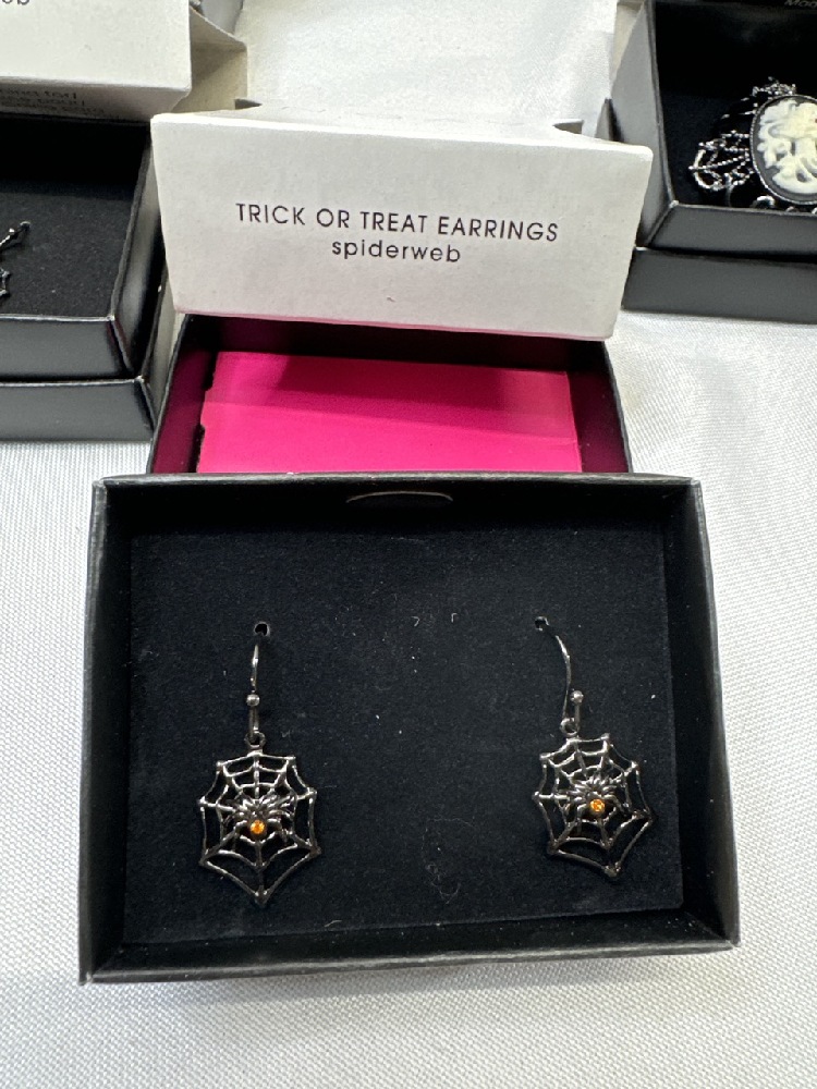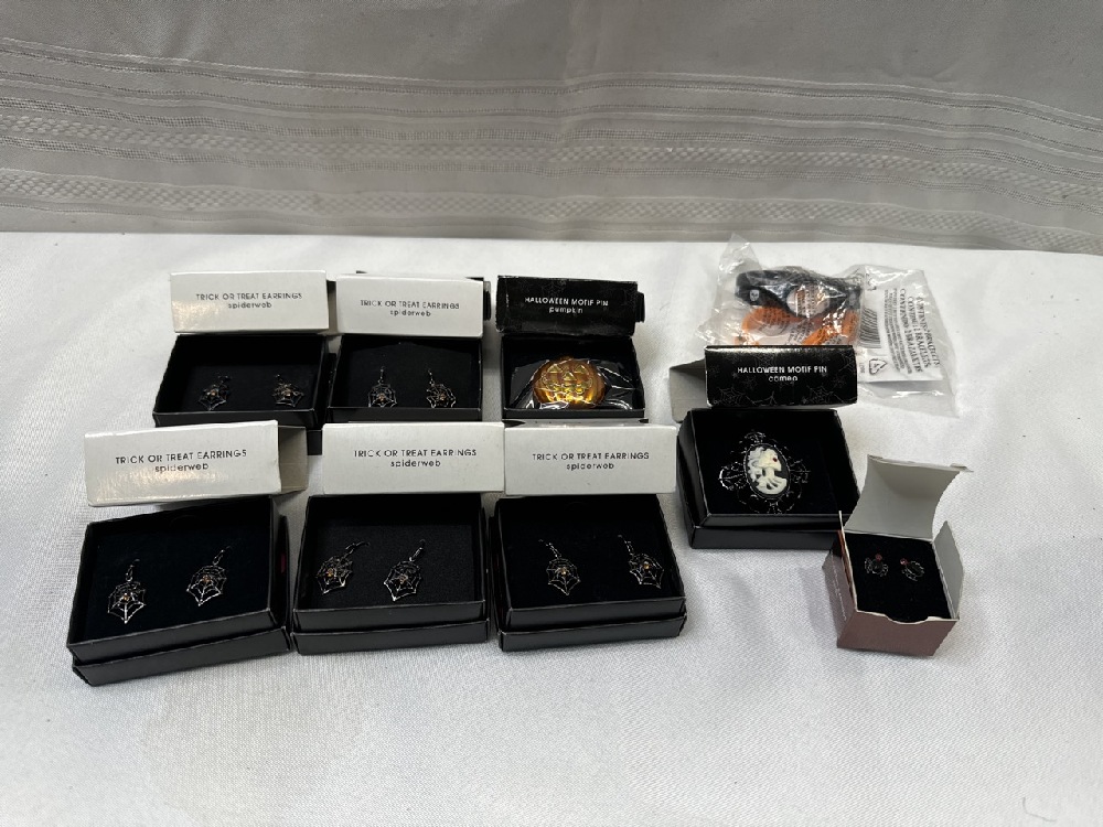 Vtg Avon Halloween Jewelry- (5)Trick or Treat Spiderweb Earrings, Halloween Motif Pin, Halloween Spider Earings, Halloween Pumpkin Pin, & 2- Halloween Lighted Bracelets