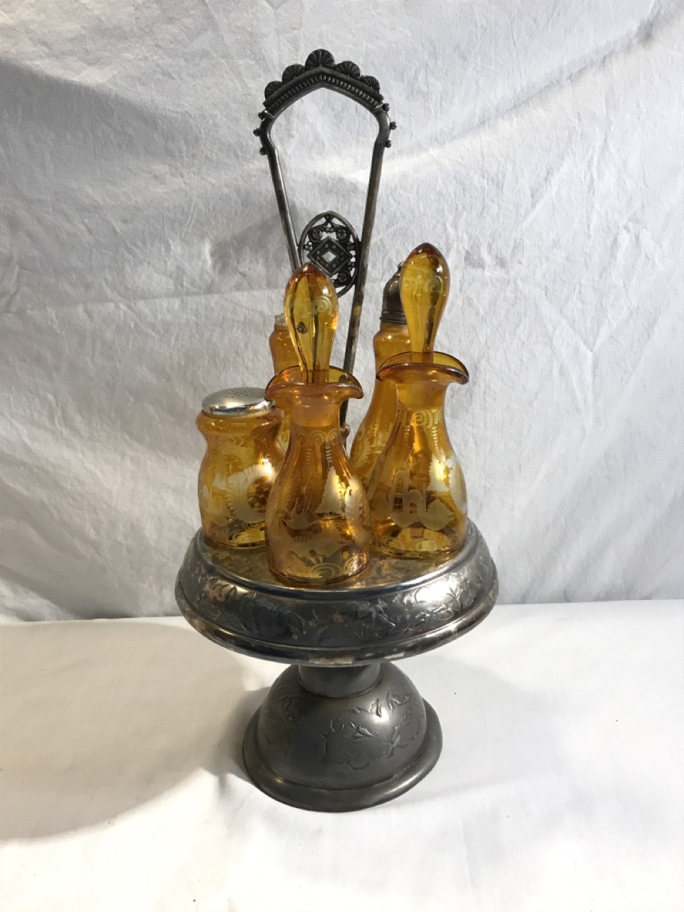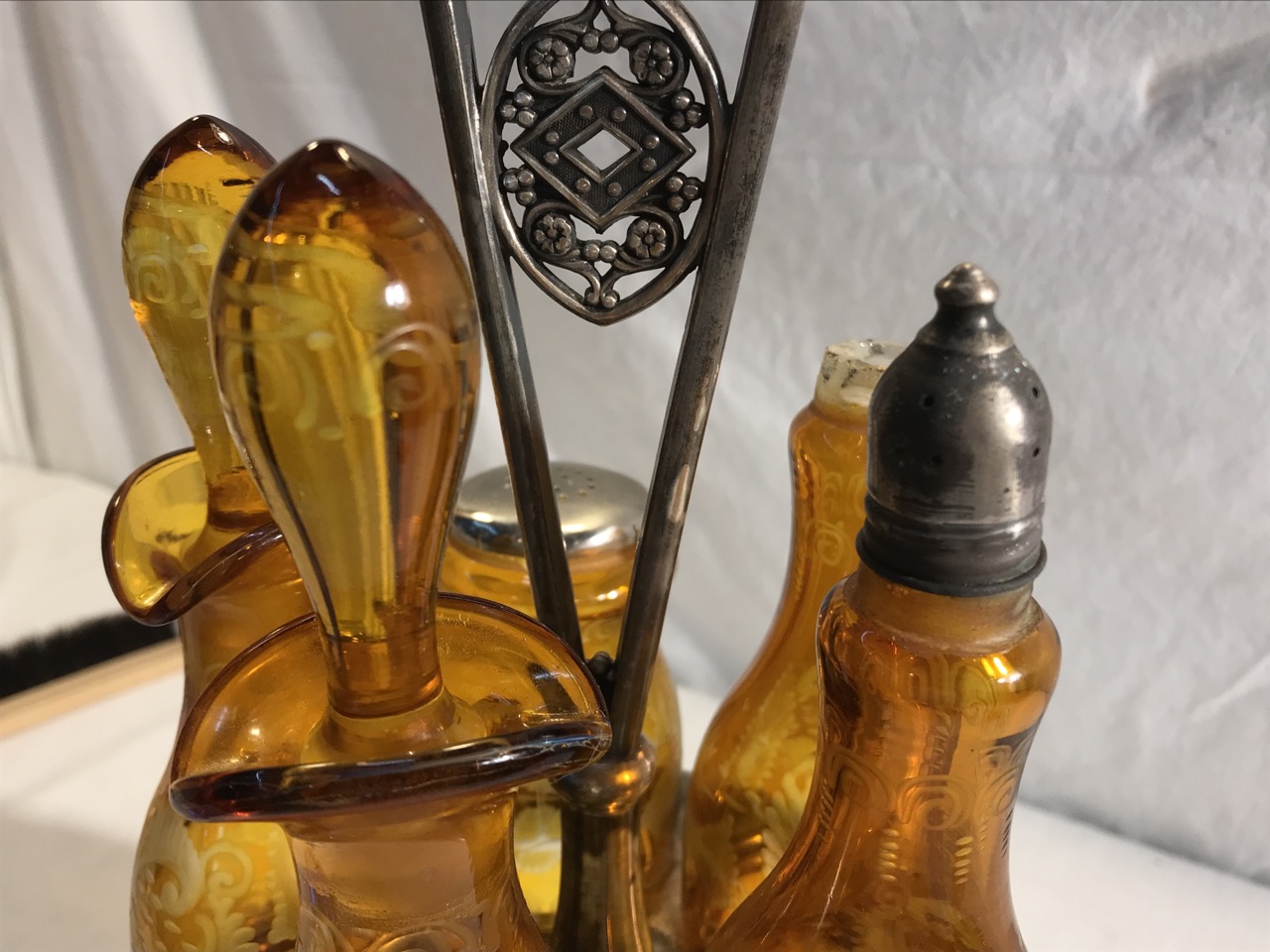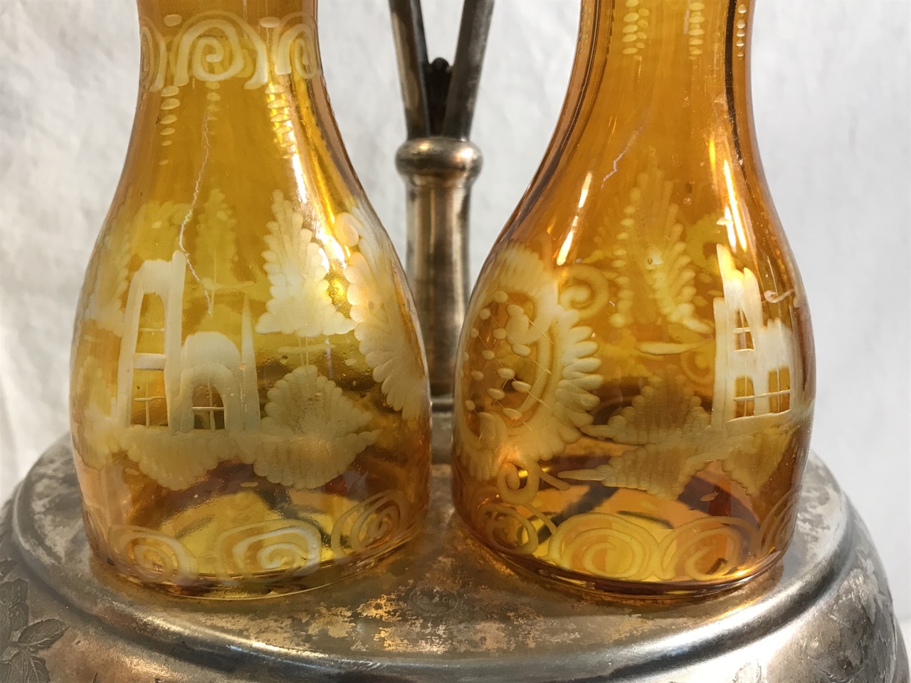 Vintage Cruet Set - Silver Plate / Etched Amber Glass- Missing one lid