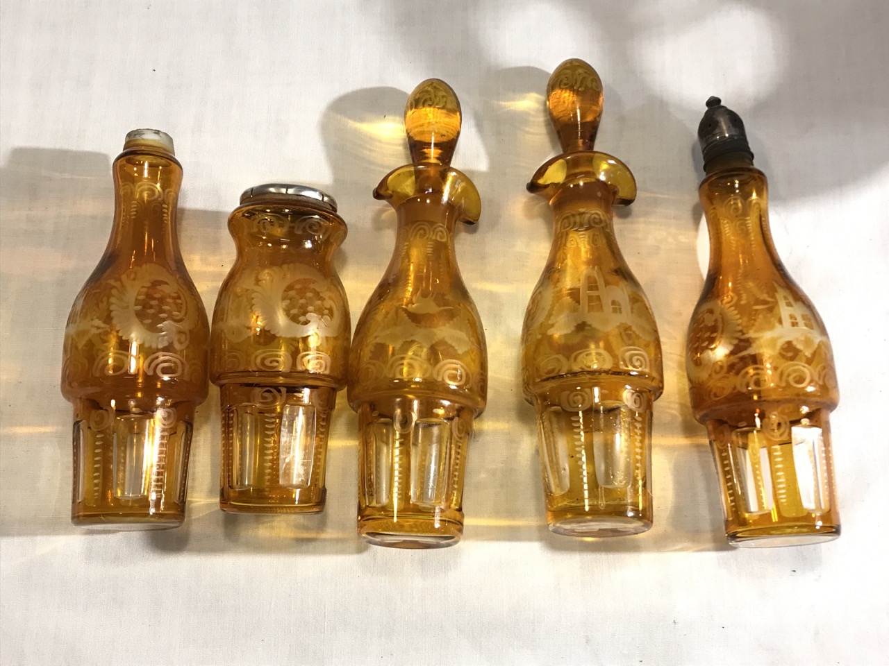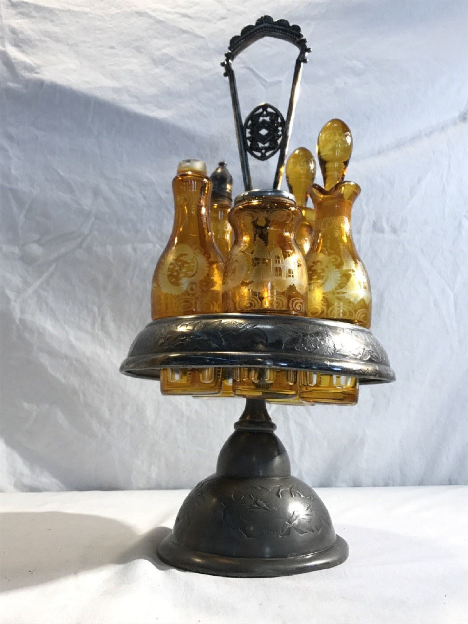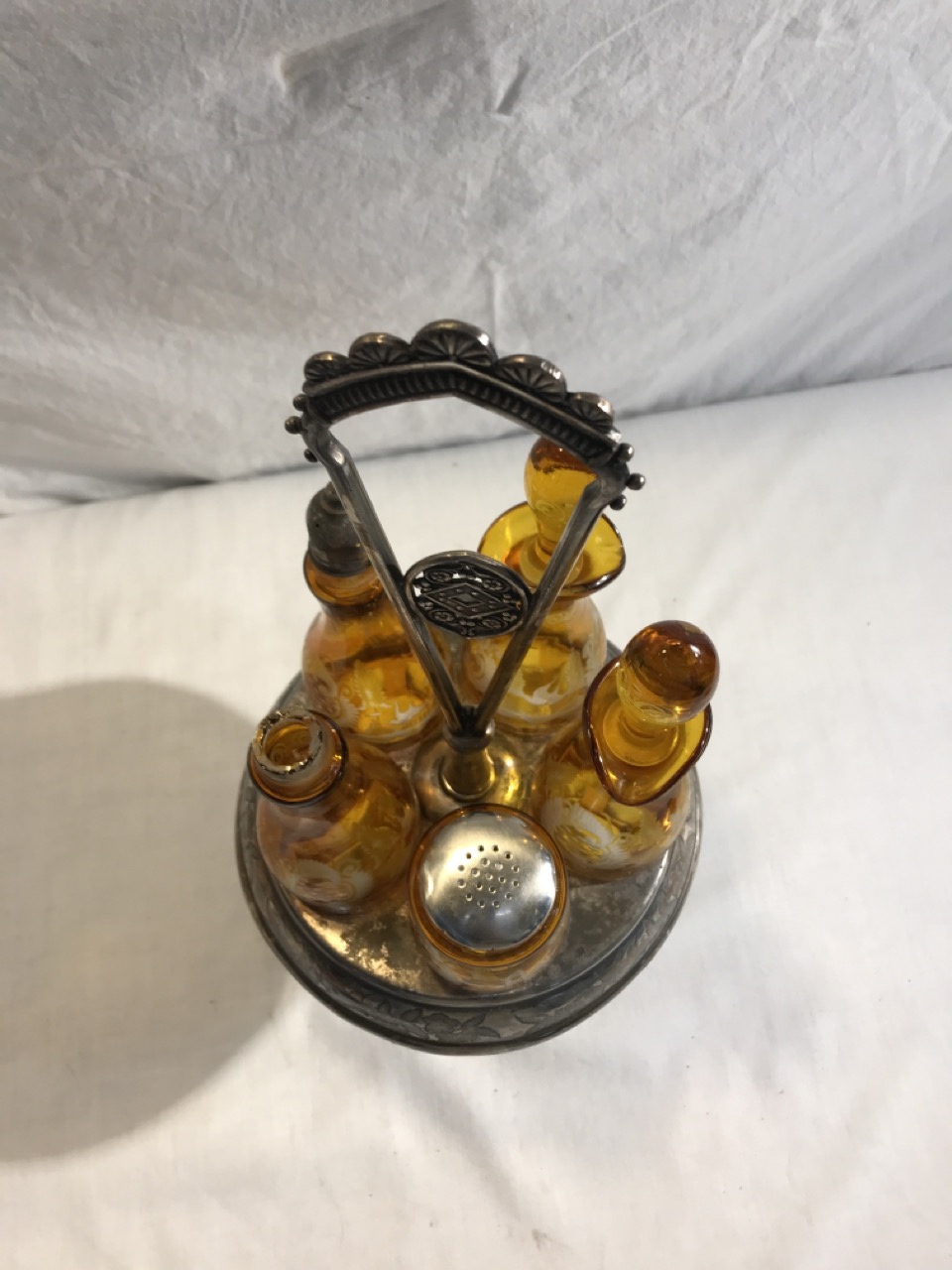 Vintage Cruet Set - Silver Plate / Etched Amber Glass- Missing one lid