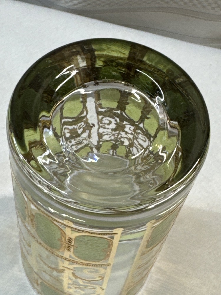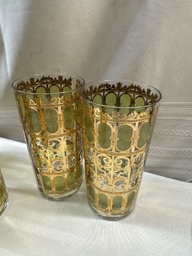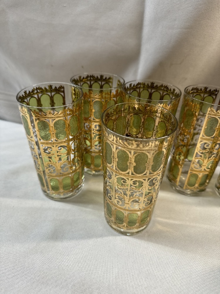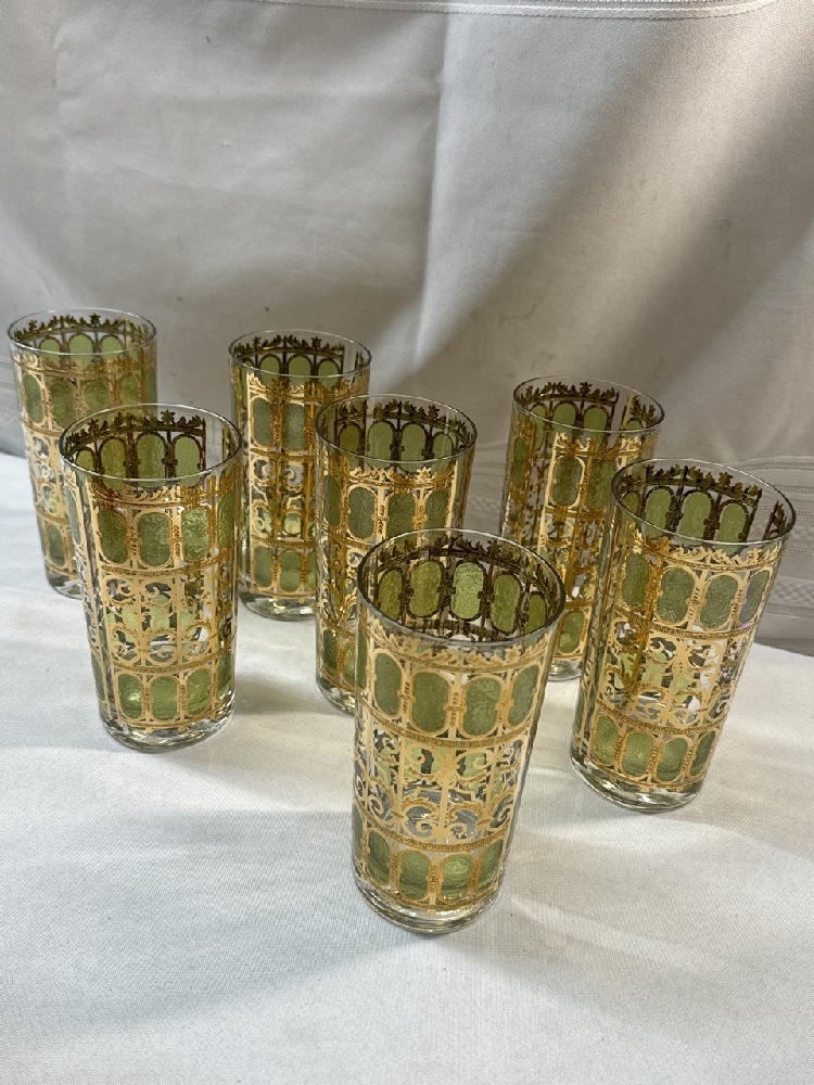 7- MCM Culver Signed 12 Oz Green & Gold Gate Trellis Glasses