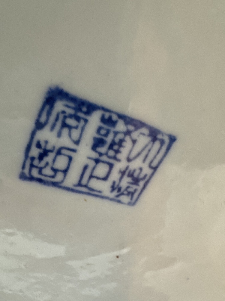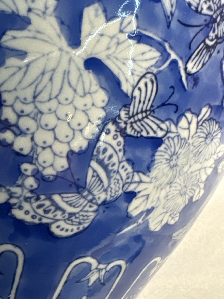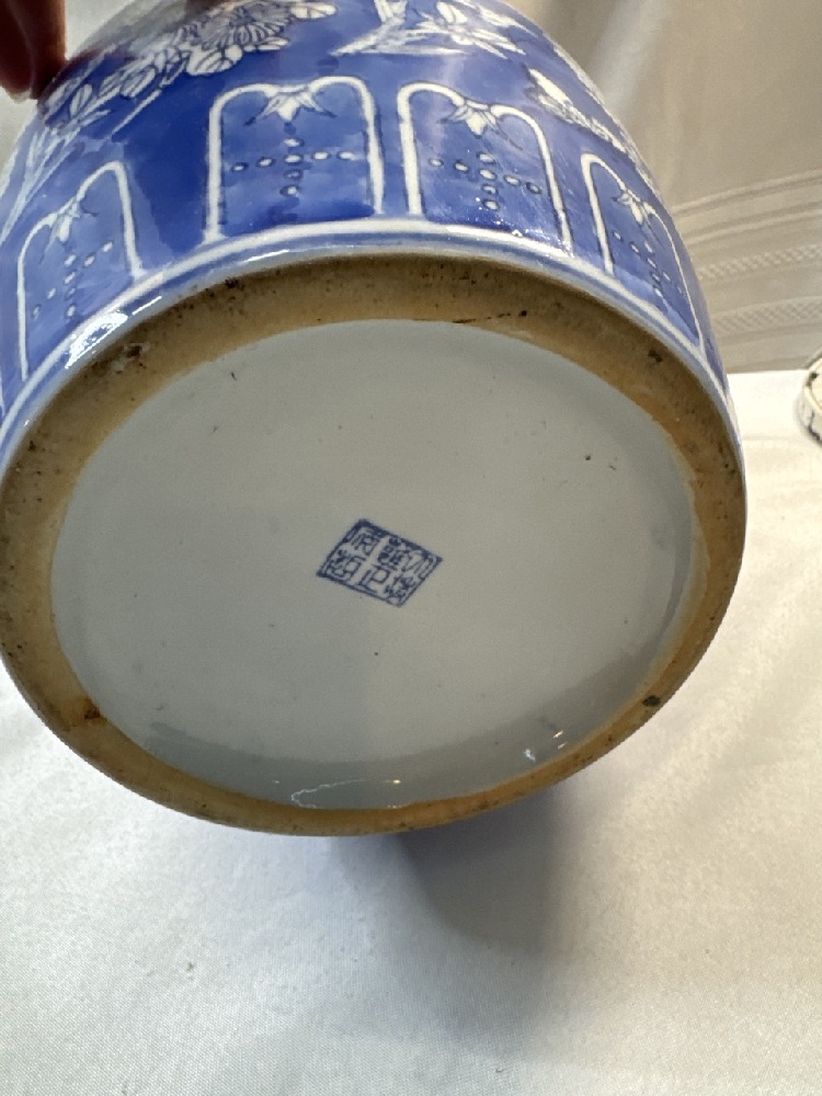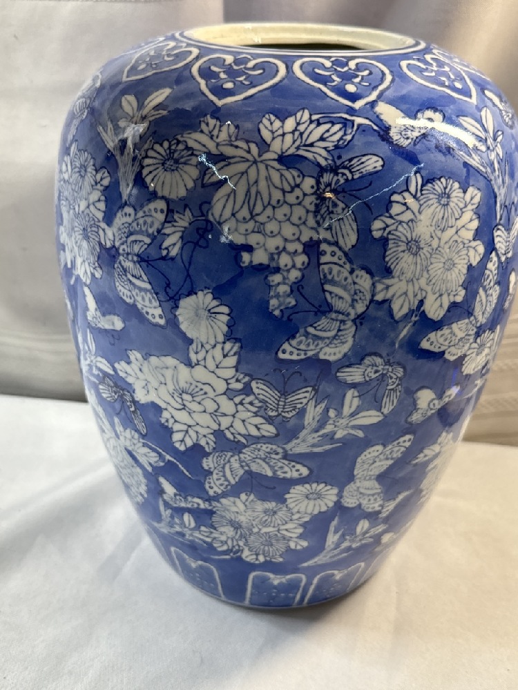 Antique Japanese Blue & White Signed Prunus Flower Vase- 12” T x 9” Round