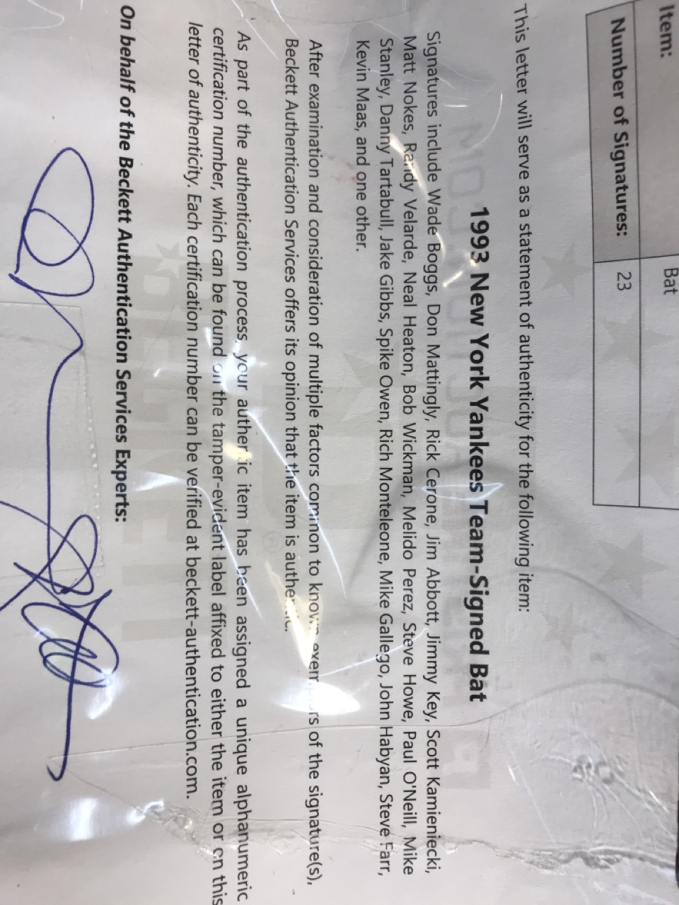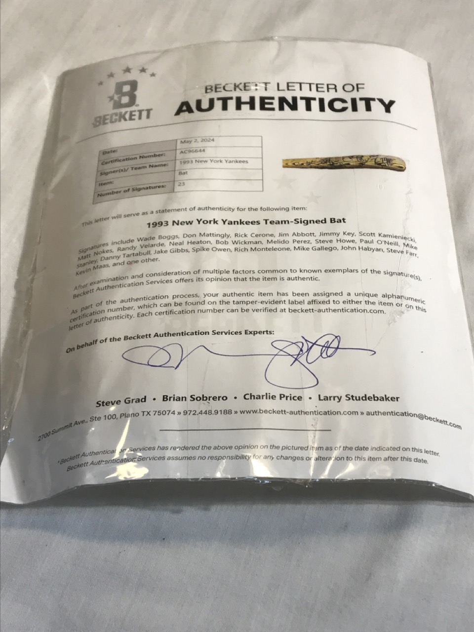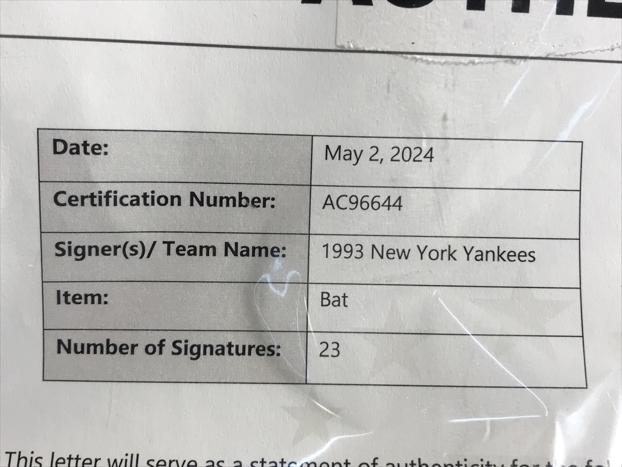 1993 New York Yankees Team-Signed Bat W/ Letter of Authenticity - Beckett Cert. # AC96644