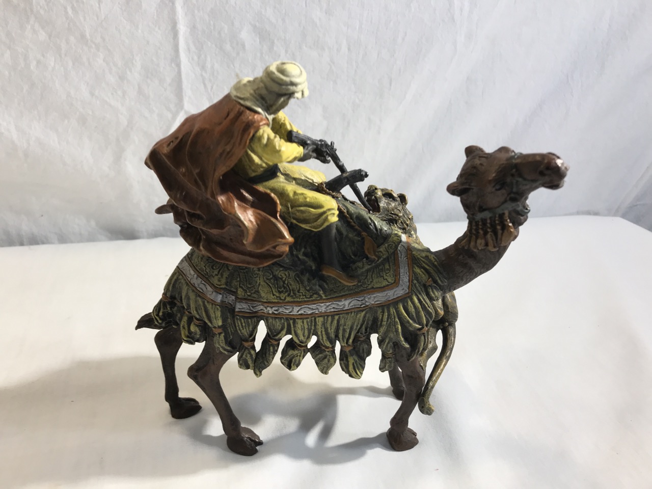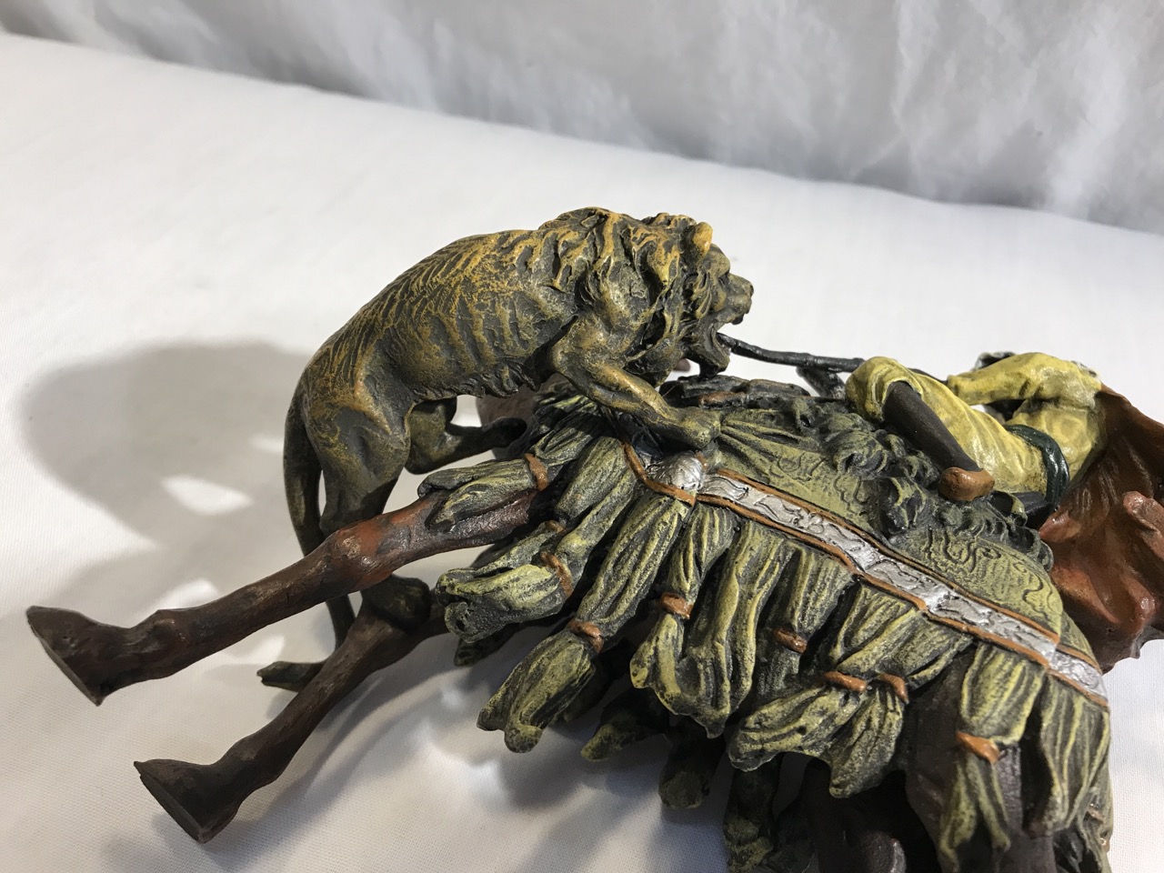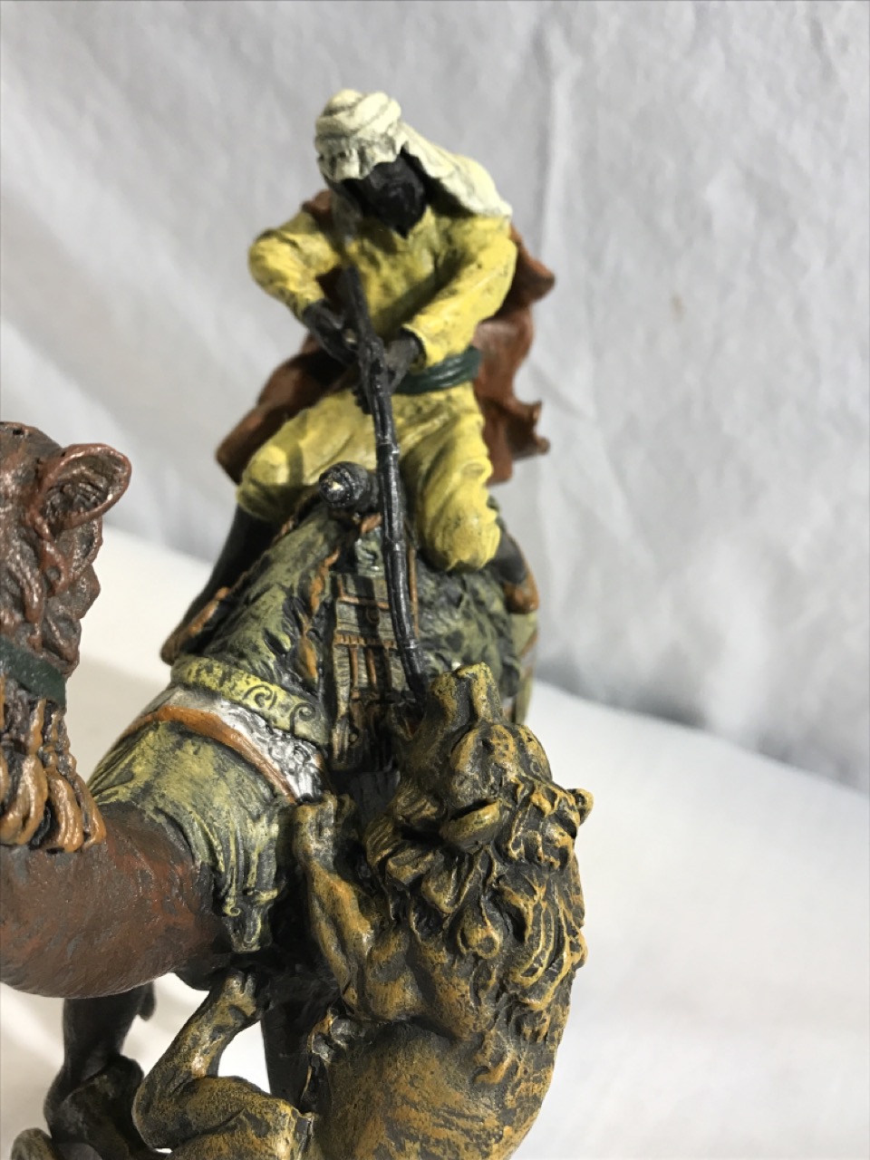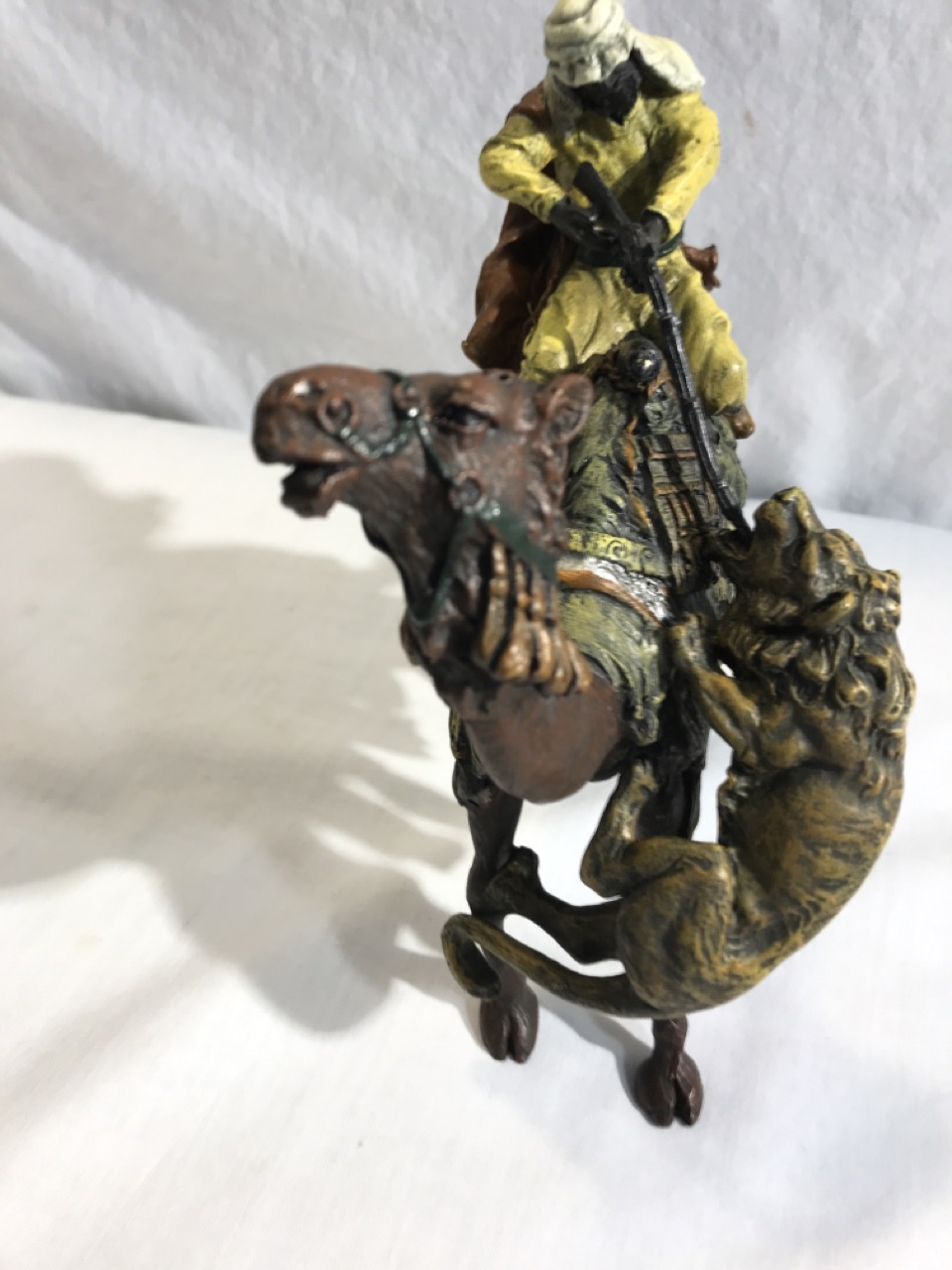 Bronze Sculpture Arab Hunter On Camel Fighting Lion- 7” L x 7.5” T x 4” D