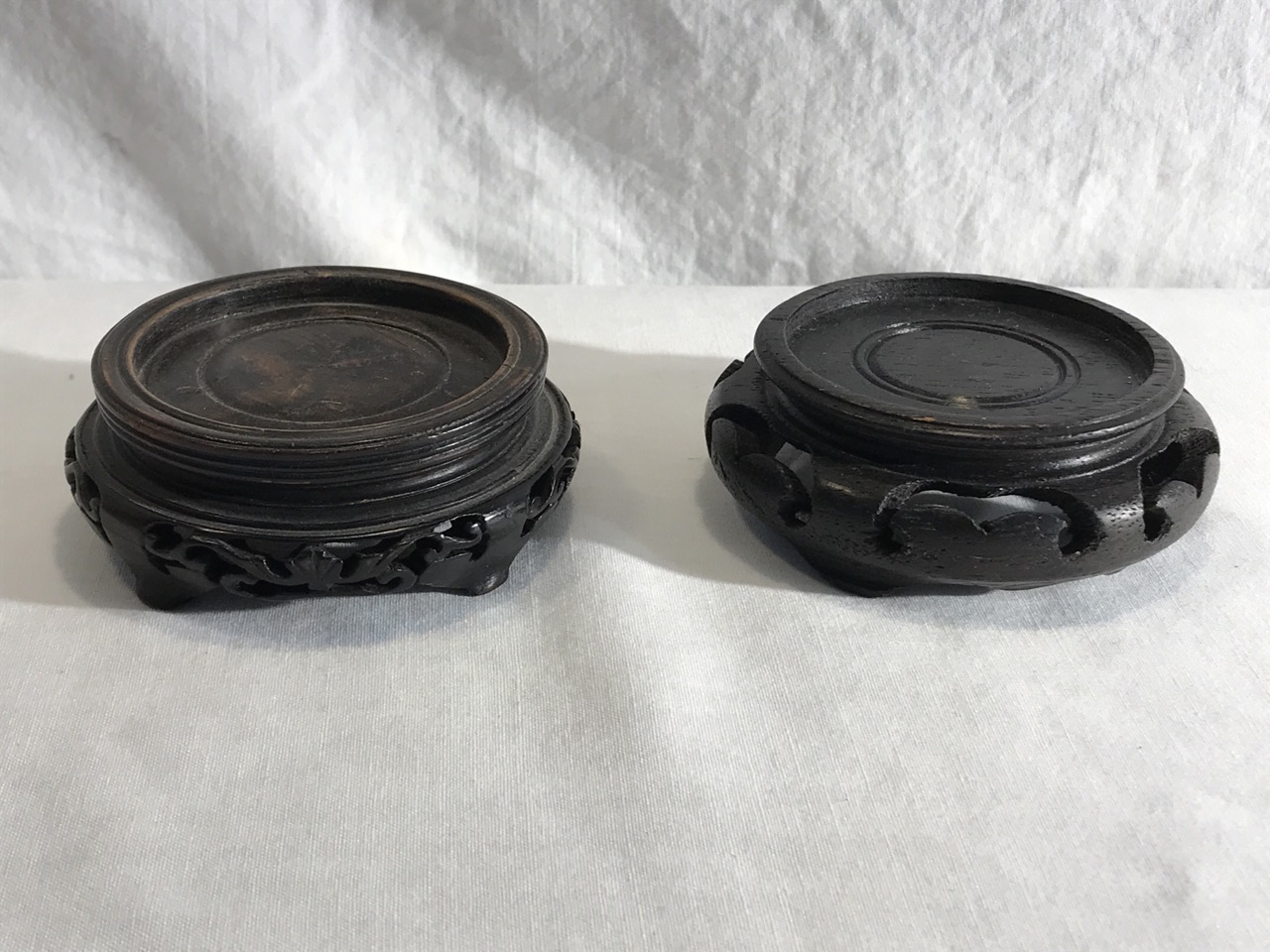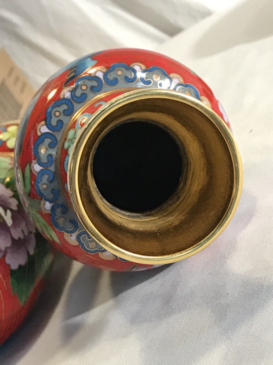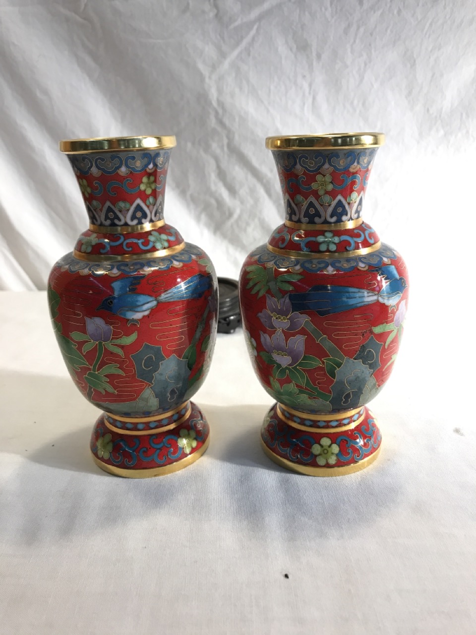 2 Vintage Jingfa Cloisonné Vases W/ decorative wood stand - 6 1/2” tall