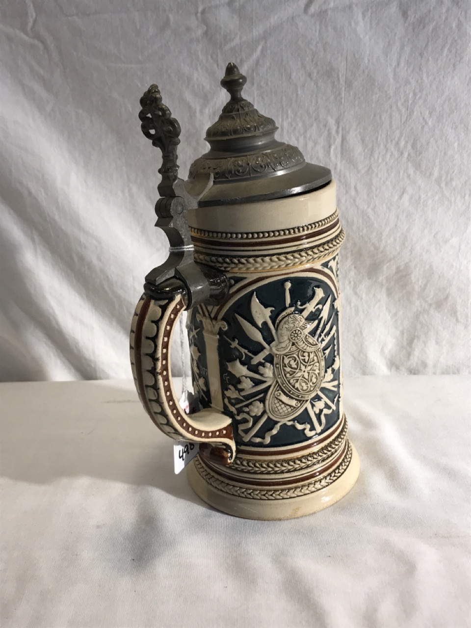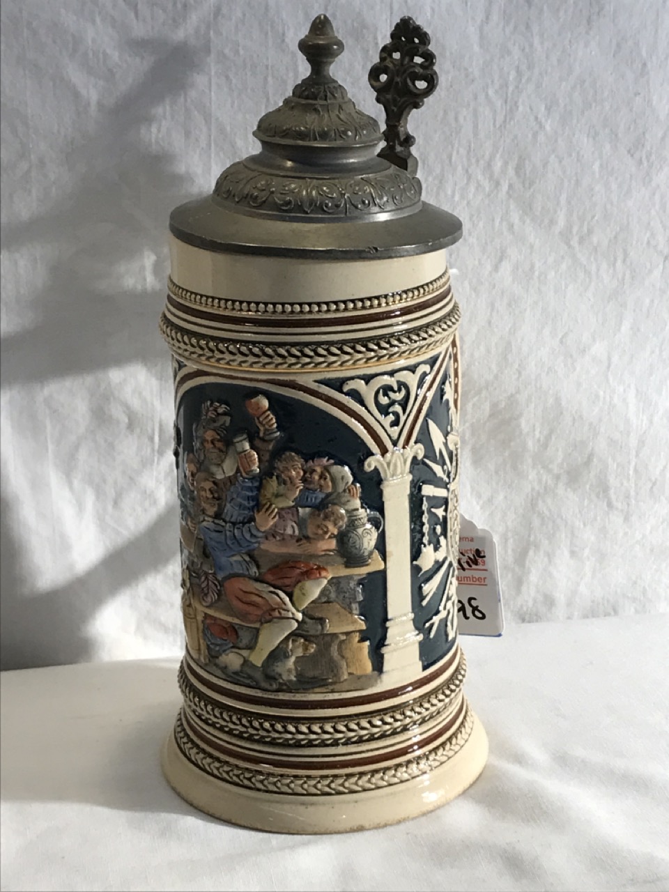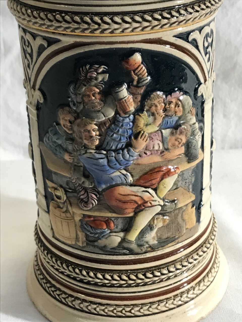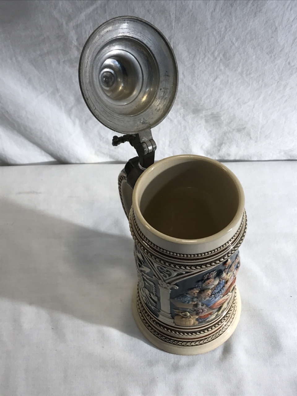 Vtg. German Beer Stein w/ Pewter Lid - Polychrome Tavern Scene