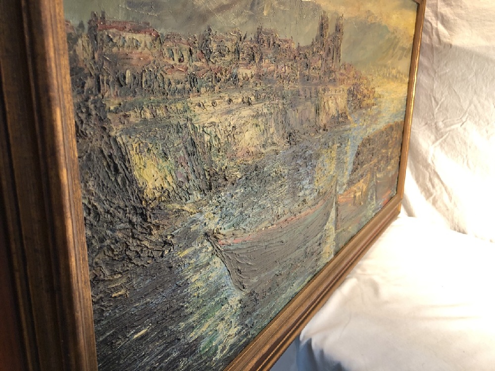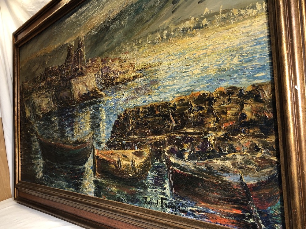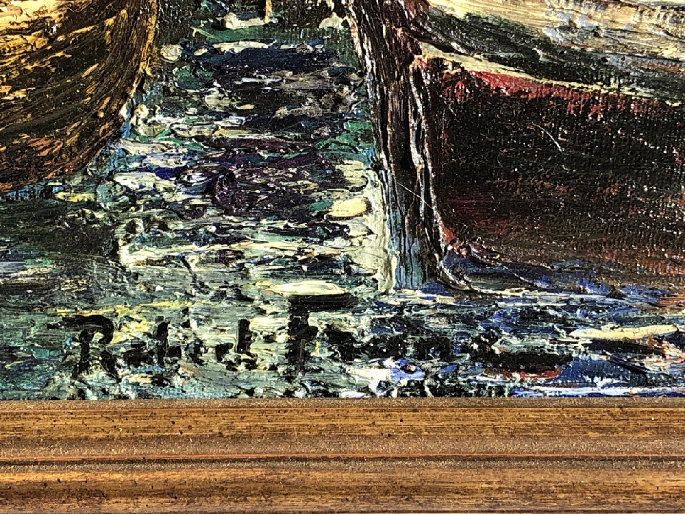 Vintage Framed Oil on Canvas Boat Scene - Signed ~ 41 1/2” x 23 3/4”