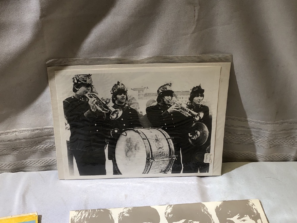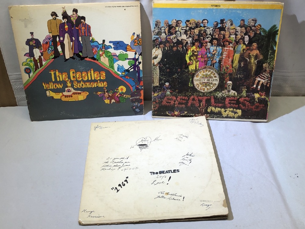 Beatles LPs ( Yellow Submarine, Lonely Hearts and White Album) , 3 Posters ( 2) 11” x 14” and 1) 8 x10) and 1997 Calendar